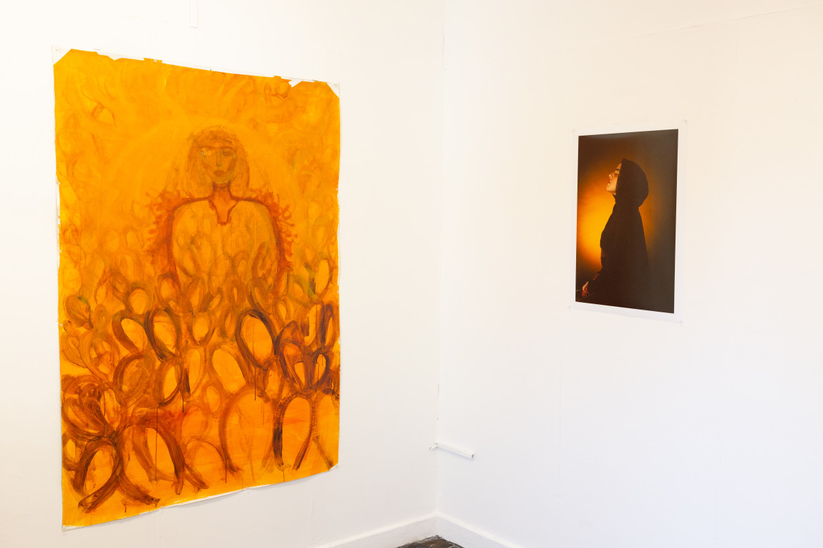 شمس هي بورتريه ذاتي لي، تلعب دور المرأة في رؤيتي لنفسي، انثى ذات شعر قصير داكن اللون ترتدي ثوبها التراثي الفلسطيني.
