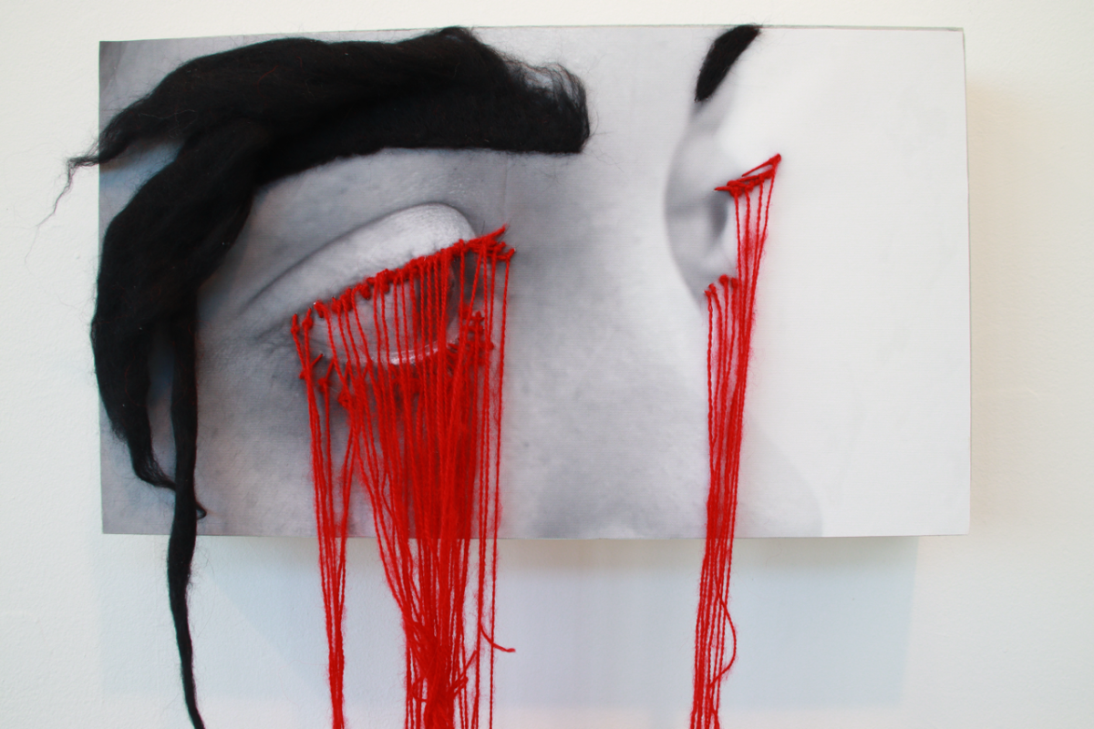 I pierce the canvas with the sharp needle and embroider with wool the photographed, realistic body parts, creating a kind of photo-embroidered hybrid. Through the rough needle action, and in an attempt to cover and beautify the holes with the embroidery and felting of the wool, I make them huge and conspicuous to the eye.