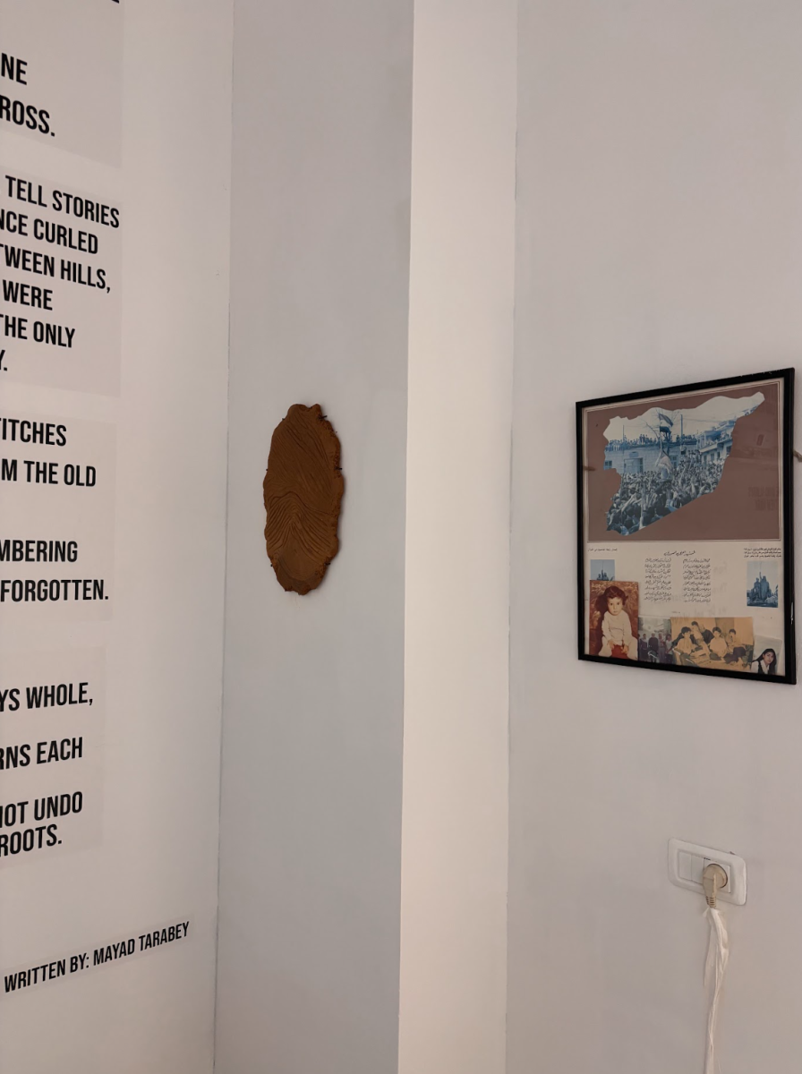A collaborative poetic text breaks the ambiguity of the visual works. A Syrian anthem from 1983, once on my grandfather’s wall, fades over time, testifying to belonging beyond our control. A sculpture of soil and water bears a fingerprint, marking existence, persistence, and personal impact.